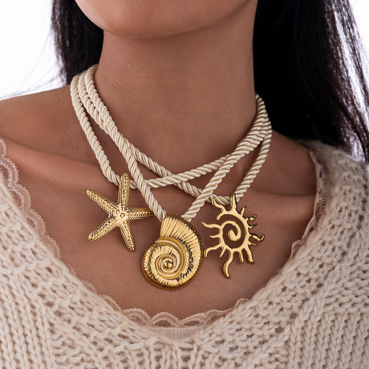 Collar colgante con cuerda cremita con dijes de acero inoxidable estrella y concha