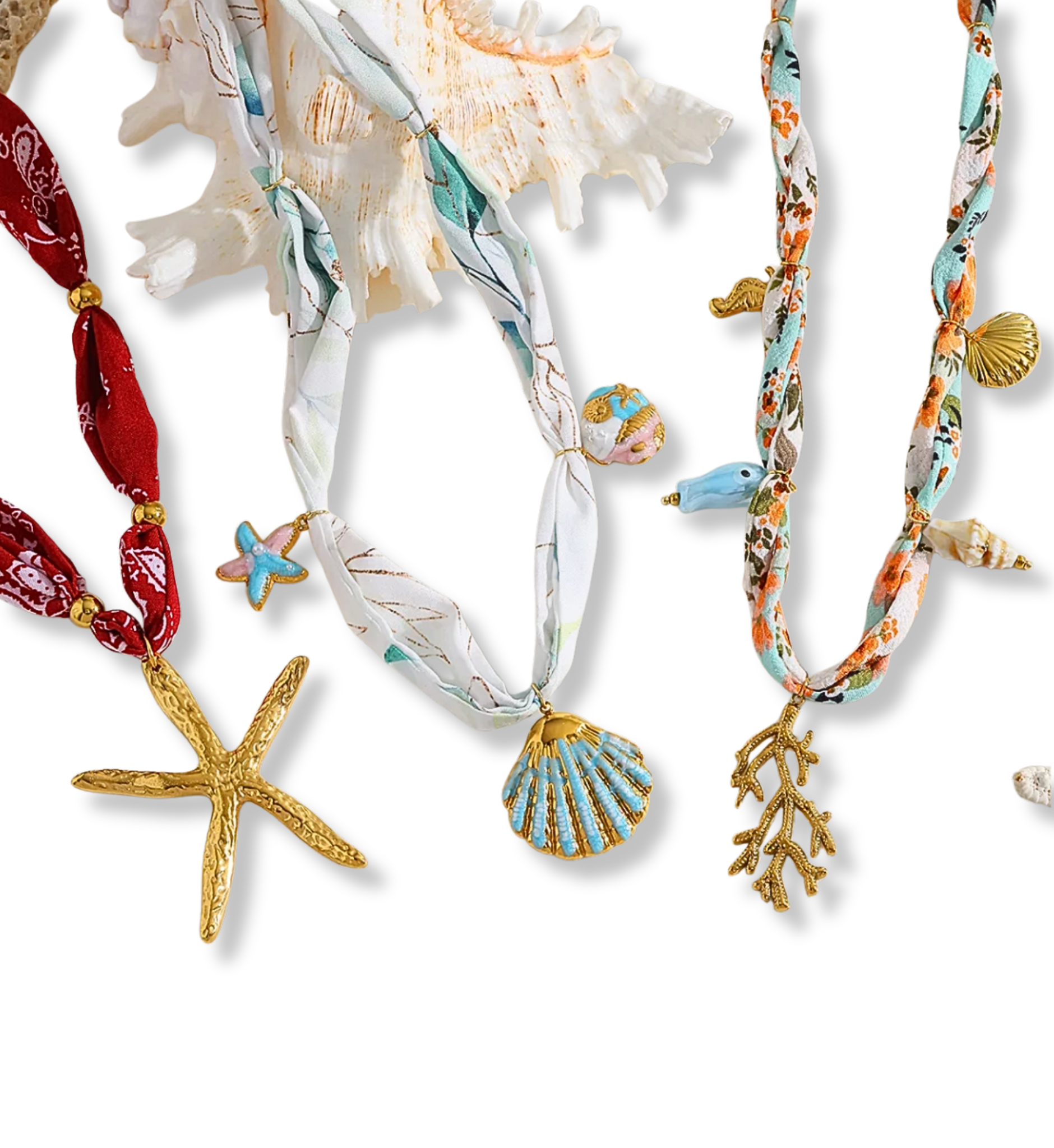 Collares de seda Poliéster con material de acero inoxidable estilo verano con dijes como estrella de mar, coral, cascarón