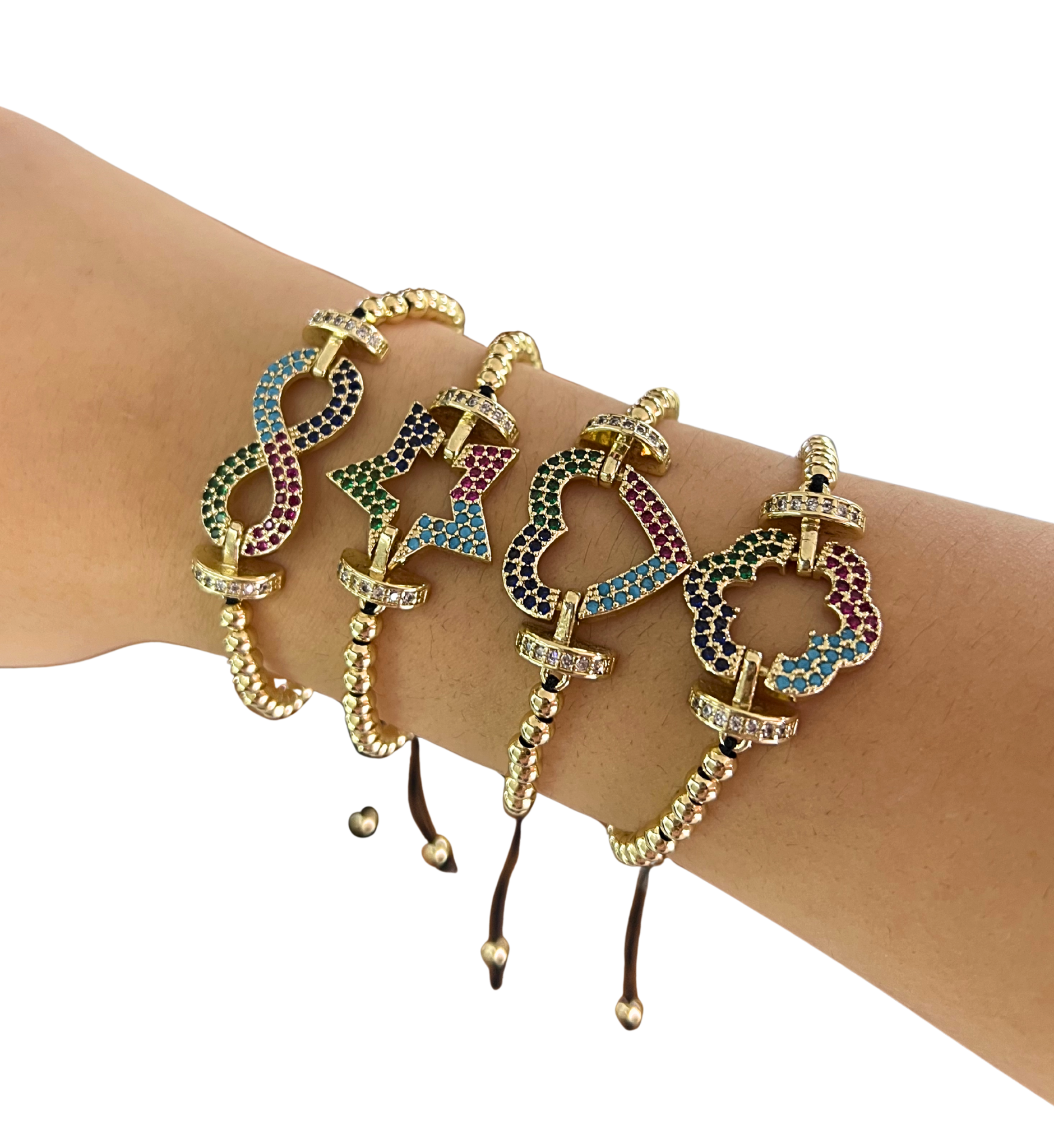 Pulseras de oro laminado con figuras ajustables de hilo.