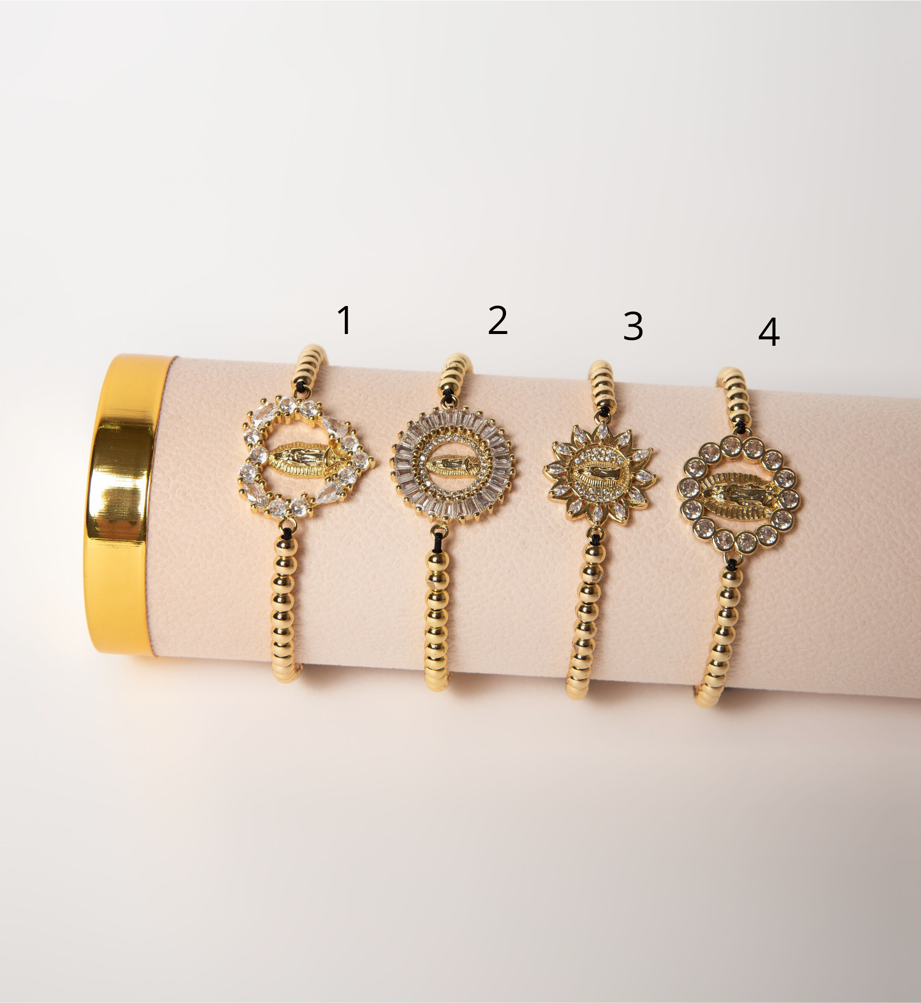 Pulseras de oro laminado con la virgen de guadalupe ajustable de hilo.